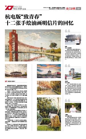 这套”杭电记忆“明信片是杭电创行社团U创计划项目组制作的,一共12张手绘水粉油画系列的照片,搜集了杭电3个校区最有代表性的景物,第一天就卖出了100多份。不少同学又来到明信片的拍摄点合影,并写下了自己的回忆。
