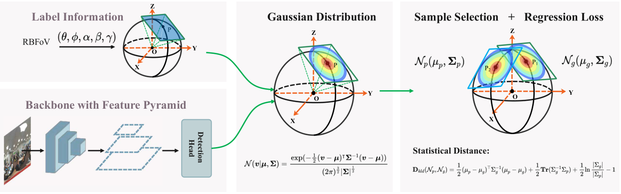 全景视觉数据是通过全景数据采集设备采集得到的全景图像或全景视频,它包含了空间中全方位360度的视觉信息,具有“视野全、可交互、沉浸感强”的特点。这使得其在很多领域都得到了很好的应用,如虚拟现实、机器人、视频监控等。本研究工作专注于全景视觉目标检测领域,提出了一种简单有效的回归损失函数来提升全景视觉目标检测算法的性能。具体来说,在训练阶段,首先将预测的球面矩形框和真实的球面矩形框的切面转换成高斯分布。然后,使用K-L散度来度量两个分布之间的距离。在测试阶段,直接从已训练模型中获得球形包围框的输出,因此网络的推理时间保持不变。整个方法的框架如下所示: