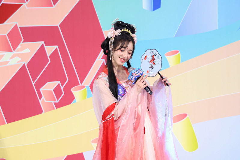 身着水粉汉服的摩洛哥选手荣希玛一登场就引发赞叹。她盘着中式发髻,手持团扇,一颦一笑皆是风采。