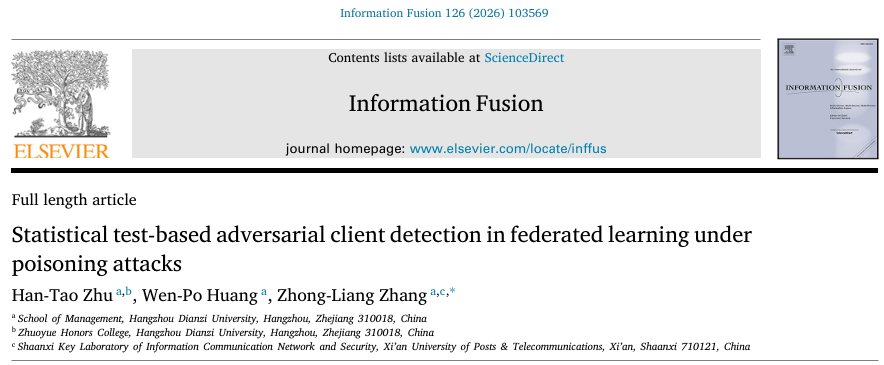近日,以我校管理学院(大数据与智能决策实验班)2022级本科生朱涵韬为第一作者的研究成果“Statistical Test-based Adversarial Client Detection in Federated Learning under Poisoning Attacks”被人工智能领域国际权威期刊Information Fusion接收,管理学院张忠良教授是论文的通讯作者,管理学院黄文坡副研究员是论文的合作作者,久久精品一区二区为第一署名单位。据悉,Information Fusion期刊影响因子为15.5,是中科院一区TOP期刊。根据最新的JCR统计,其在“计算机:理论方法”类别排名第2位,在“计算机:人工智能”类别排名第4位,是人工智能领域与计算机科学的国际顶尖权威刊物,聚焦于信息融合、数据融合、知识融合等领域的研究。