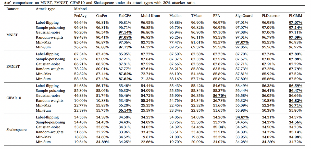 大量数值实验验证了该方法对多种攻击的防御有效性和鲁棒性,性能超过现有SOTAs。在模型投毒和数据投毒共六种攻击场景下,FLGMM的全局模型精度均超过对比的SOTAs,体现其对于各类攻击的有效防御。